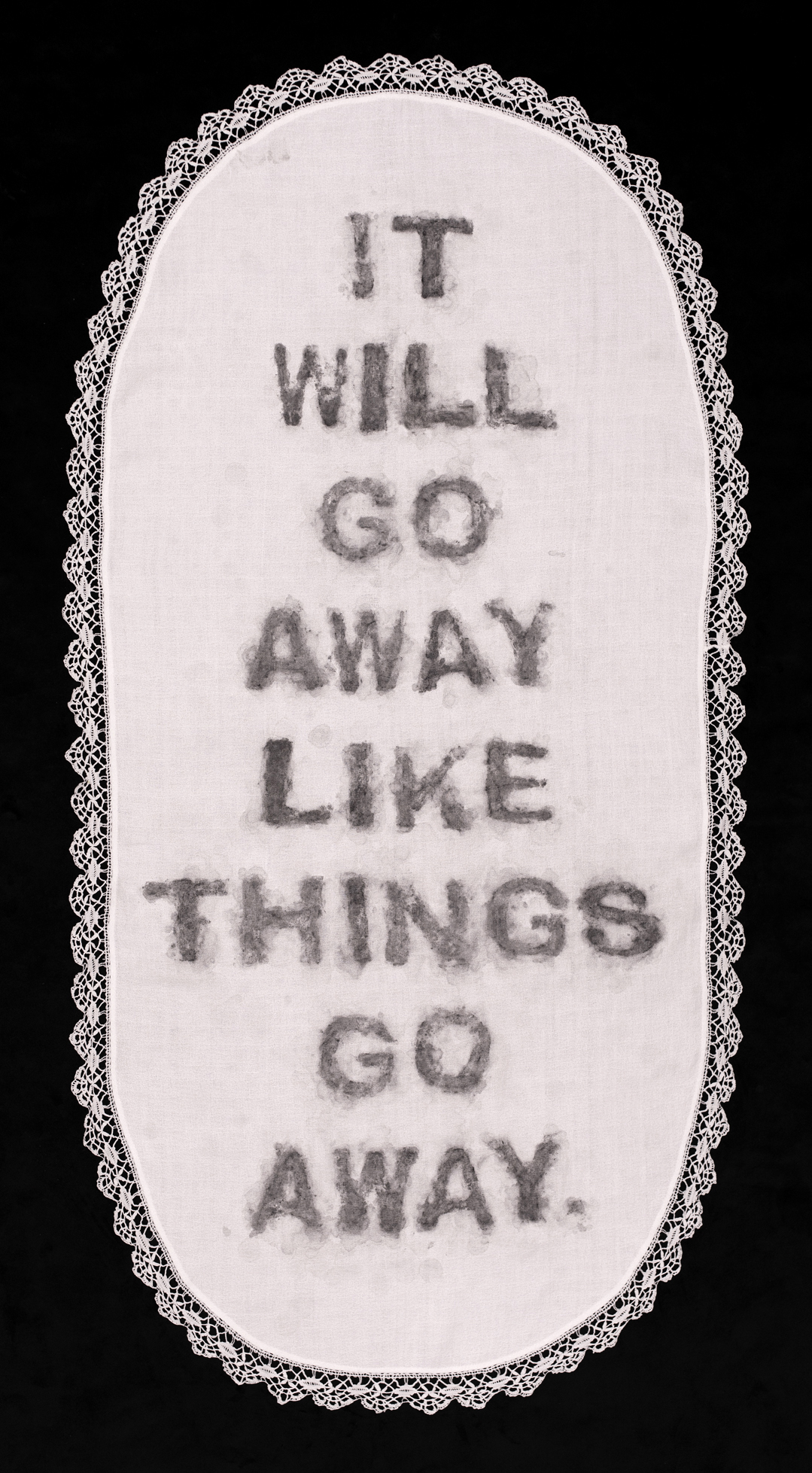 artwork displaying the remnants of charcoal soap letters on a white vintage tablecloth with lace border on a black background. The letters read "It will go away like things go away," a quote by Donald Trump.